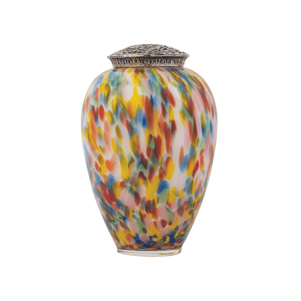The Premium Rainbow Hand Blown Glass Ashes Urn is a vibrant and unique memorial, masterfully crafted by highly skilled artisans. This urn is mouth-blown, creating a seamless, hollow piece of glass that is both strong and tactile. Each urn is infused with bright, beautiful colours that form a unique pattern, making every piece truly one-of-a-kind.