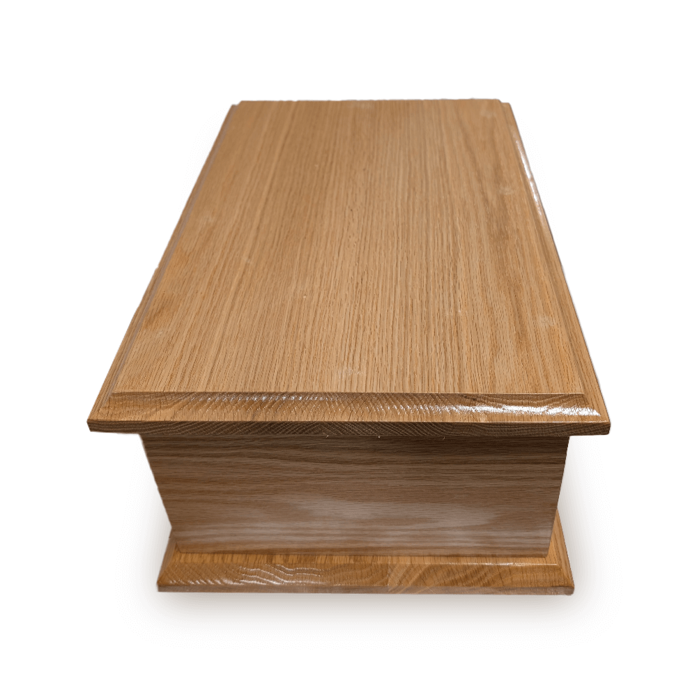 This cremation casket is meticulously crafted from responsibly sourced solid oak wood, chosen for its durability, strength, and timeless beauty. The warm, natural grain of the oak is complemented by a smooth, glossy finish that enhances its appearance while offering long-term protection. This finish ensures the casket resists wear and tear, maintaining its polished and dignified look over time. Using sustainably sourced materials demonstrates a commitment to environmental consciousness and quality craftsmanship, providing peace of mind to families who value eco-friendly practices.