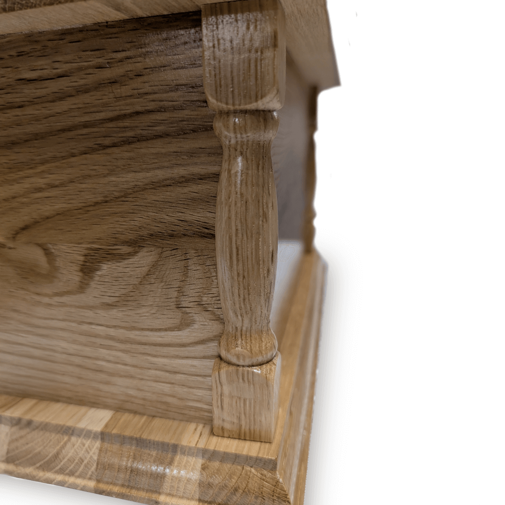 The pillared design of this cremation casket adds a touch of classic elegance, making it stand out as a truly dignified choice. The craftsmanship highlights the natural beauty of the solid oak, with smooth, polished surfaces that emphasize the wood’s warm and rich tones. This timeless design complements any setting, whether displayed in your home or used in a burial service.